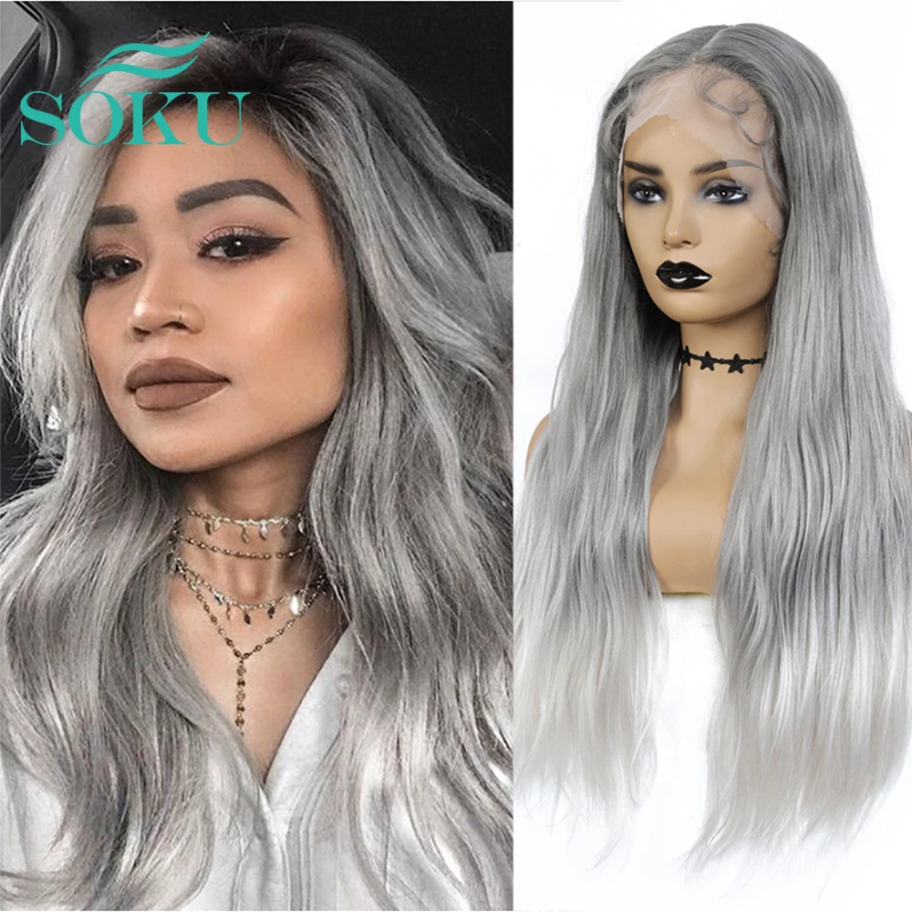 Vendedor Caliente SOKU-peluca con malla frontal para mujer afroamericana, cabellera sintética con malla frontal, Color Ondulado Natural, parte media larga, estilo moderno, fibra resistente al calor 73oqgKVaO