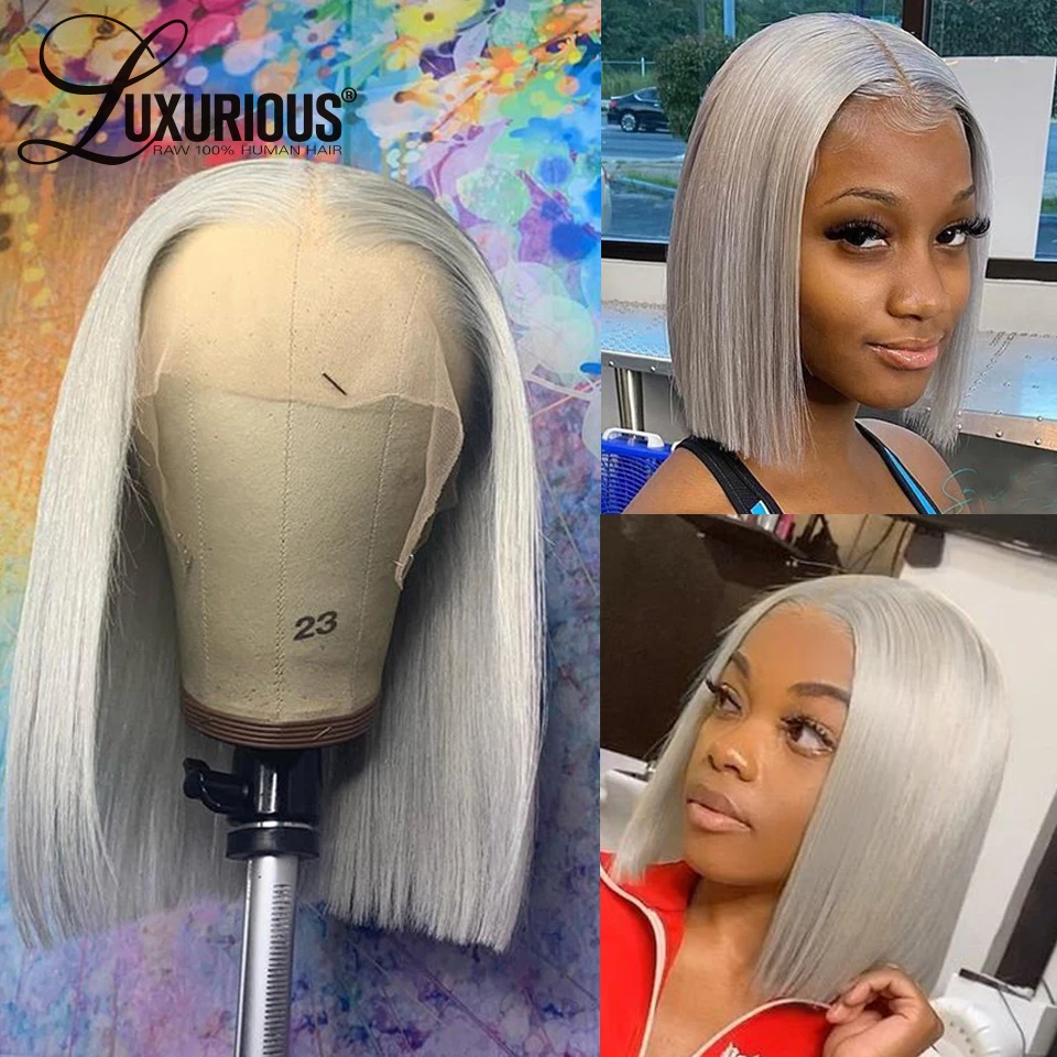 Mejor Pelucas de encaje de LUXURIOUS Official Store por Peluca de cabello humano 180% gris para mujer, pelucas de cabello humano con encaje frontal BOB corto, brasileño, Remy, transparente, prearrancado