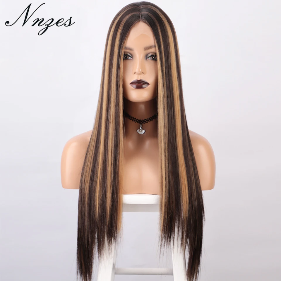Pelucas sintéticasBarato NNZES-Peluca de cabello sintético para mujeres negras, pelo largo recto de 24 y 30 pulgadas, Color marrón oscuro y Rubio, mezclado GR6JemaZEQ1