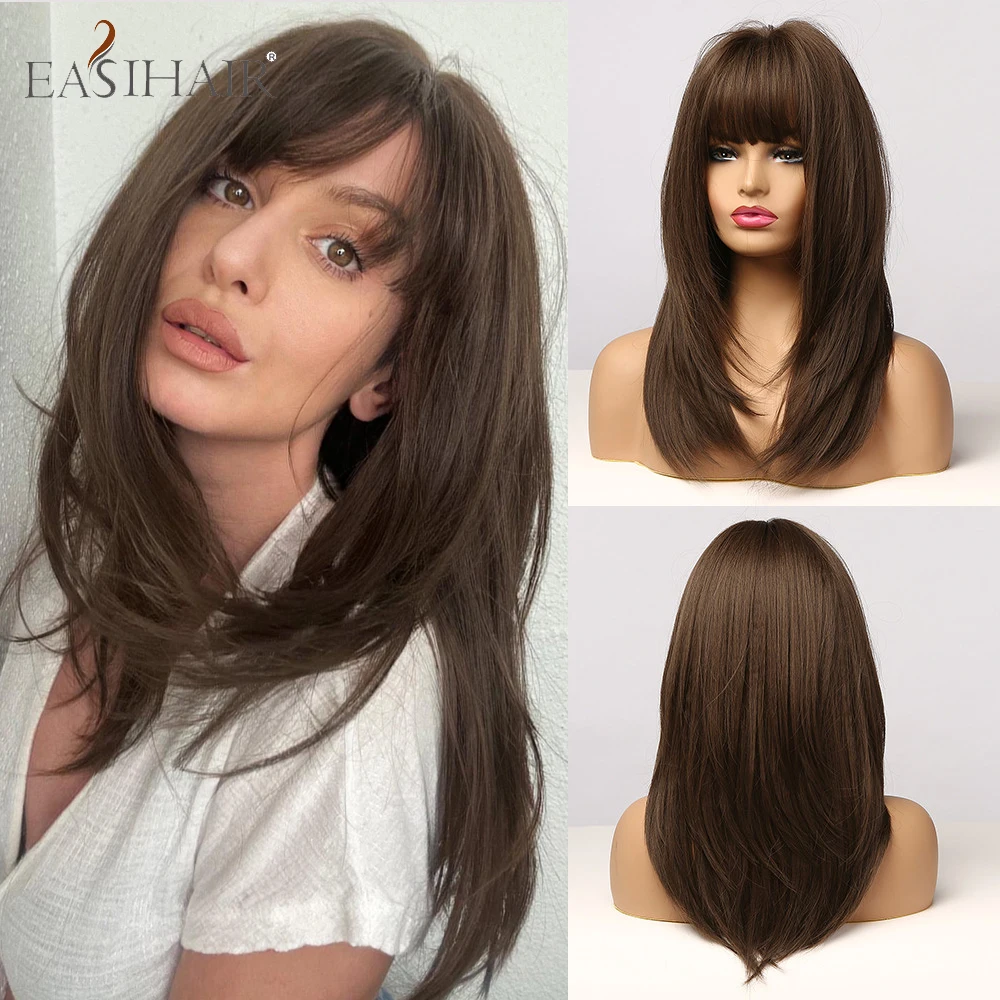 Name: EASIHAIR-Peluca de BoBo marrón oscuro con flequillo, sintética, ondulada, de capa media, para mujeres negras, Cosplay, fiesta, resistente al calor, Natural