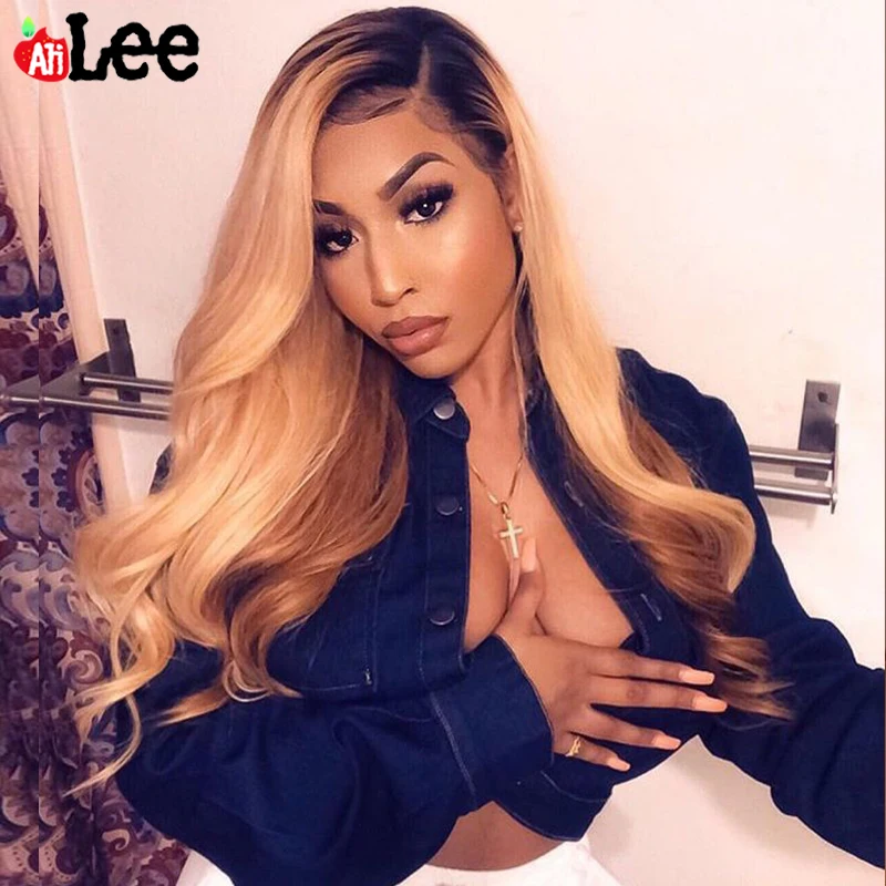 Name: Ali Lee rubio miel peluca Ombre peluca 1B/27 Frente de encaje pelucas de cabello humano de la onda del cuerpo peruano Pre arrancado transparente Frontal de encaje pelucas
